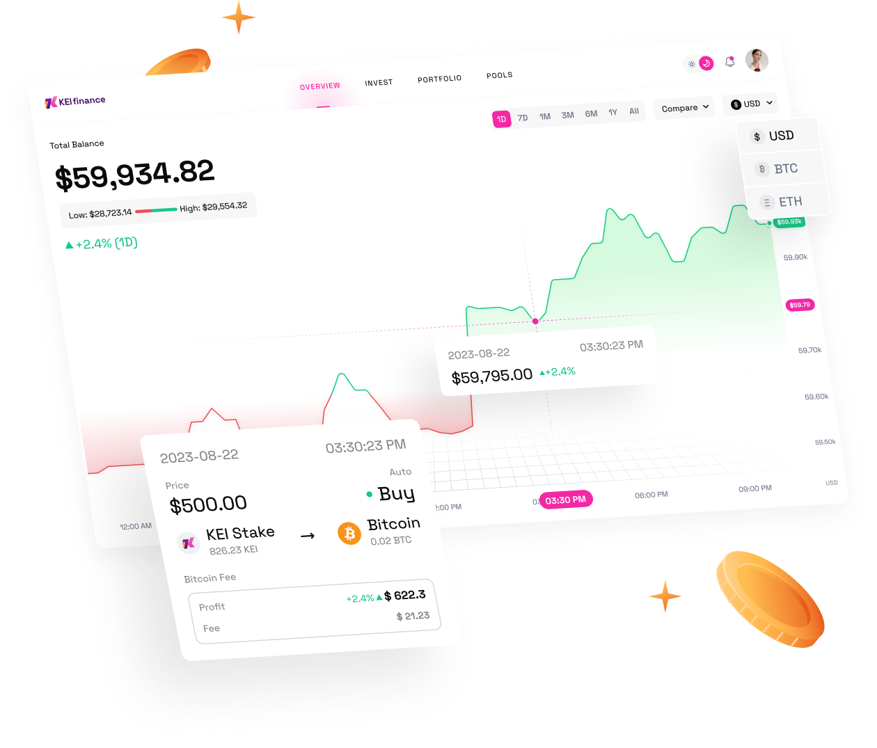 Simplify your DeFi experience with KEI finance's automated trading strategies, growing your portfolio 24/7. Access 200+ assets, use KEI Debit Cards to spend crypto worldwide, without third-party management.